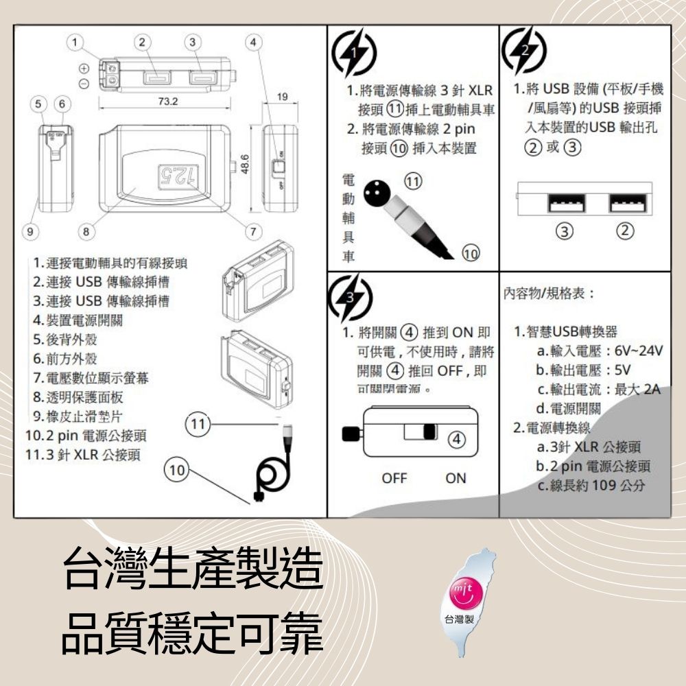 它能夠將電動輔具的電壓轉換成平板、手機以及其他USB